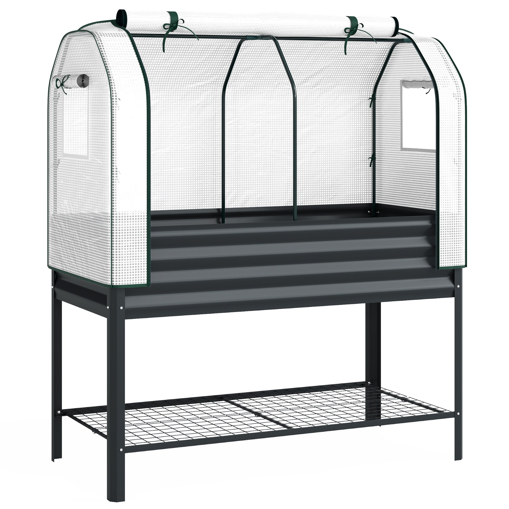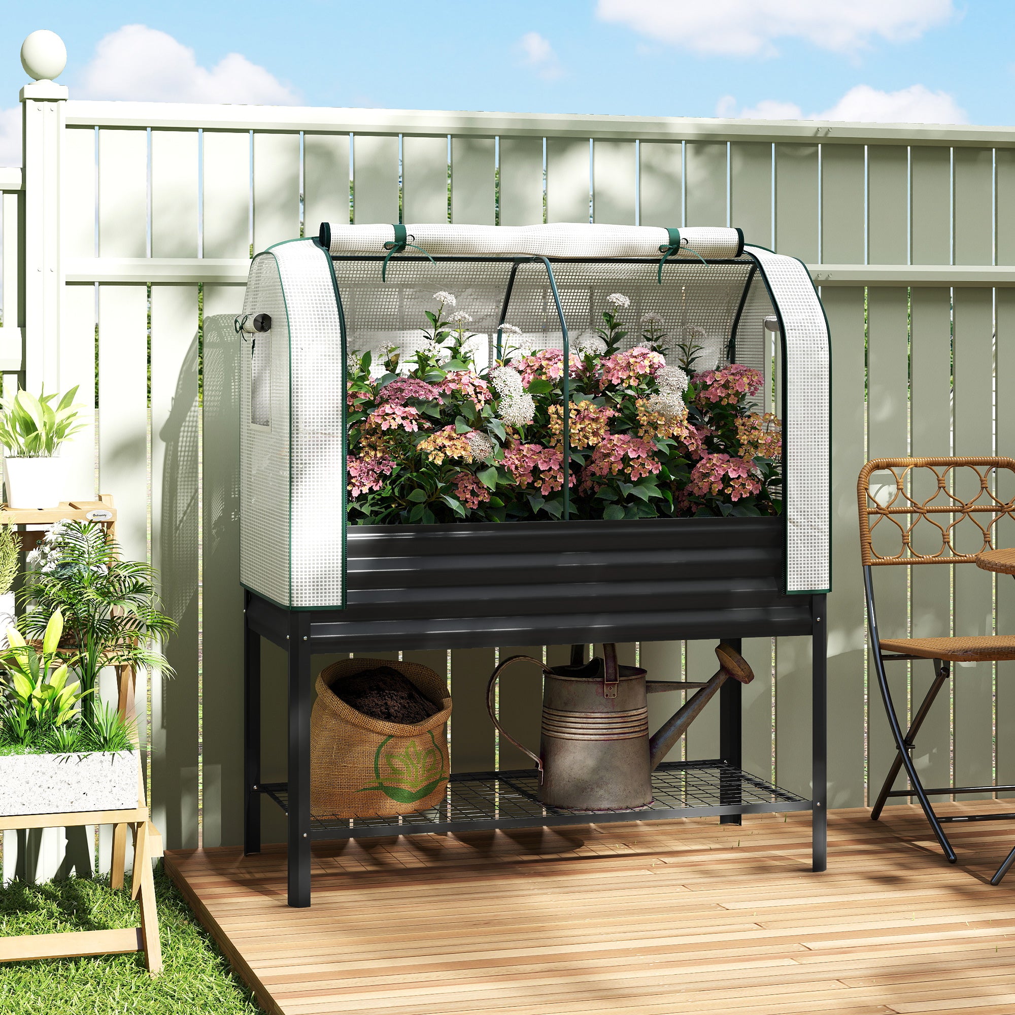 Transform your gardening experience with the Outsunny raised planter box. The PE greenhouse cover with roll-up zipper door and side vents protects plants from frost and wind while letting in sunlight and maintaining airflow. The garden planter reduces bending and strain on your back and knees and the bottom mesh shelf keeps tools and supplies within reach for easy, efficient gardening, making plant care more organized and enjoyable year-round.