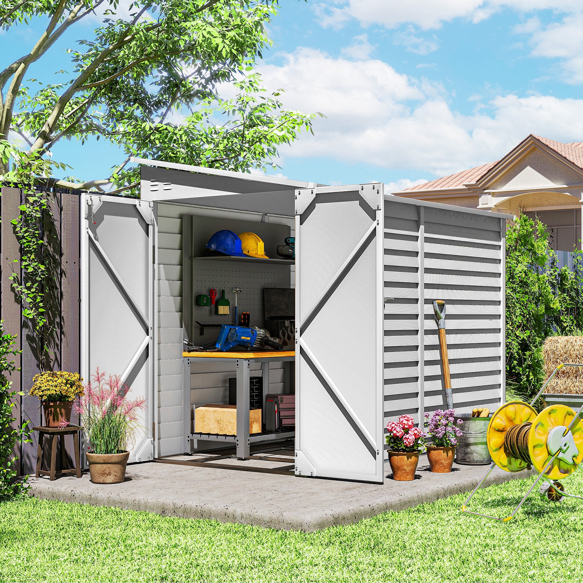 • 4.6' x 9' Steel Outdoor Storage Shed, with Foundation Kit, Lockable Doors and Gloves, White